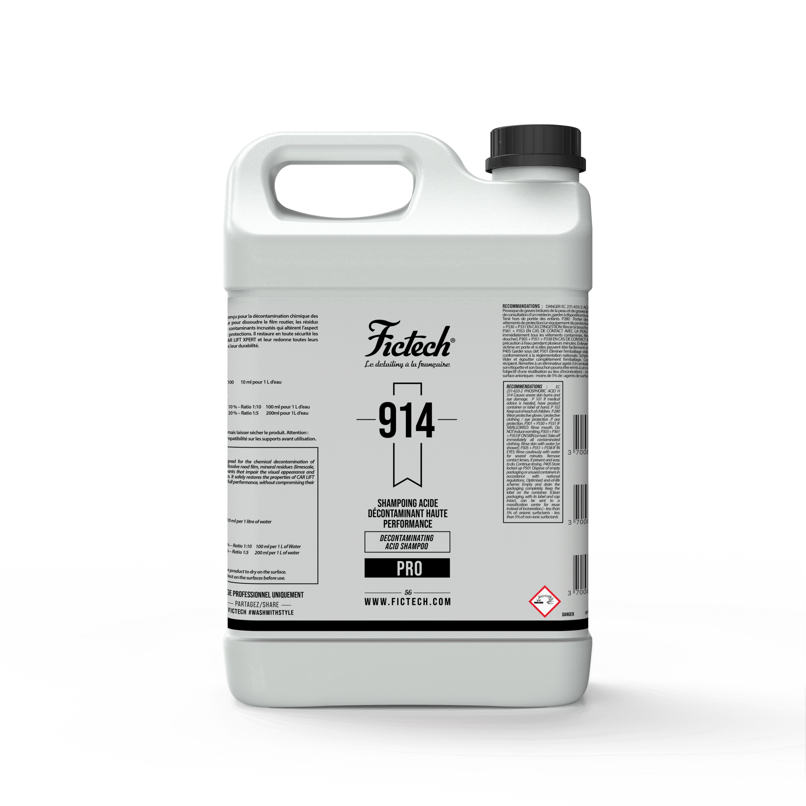 914 Shampoing Acide est un shampoing technique conçu pour la décontamination chimique des surfaces automobiles. Vous l’utilisez lorsque le lavage classique ne suffit plus : il agit en profondeur pour dissoudre le film routier, réduire les résidus minéraux (calcaire, traces d’eau dure) et décrocher les contaminants incrustés qui ternissent l’aspect et perturbent le comportement des peintures et des protections.